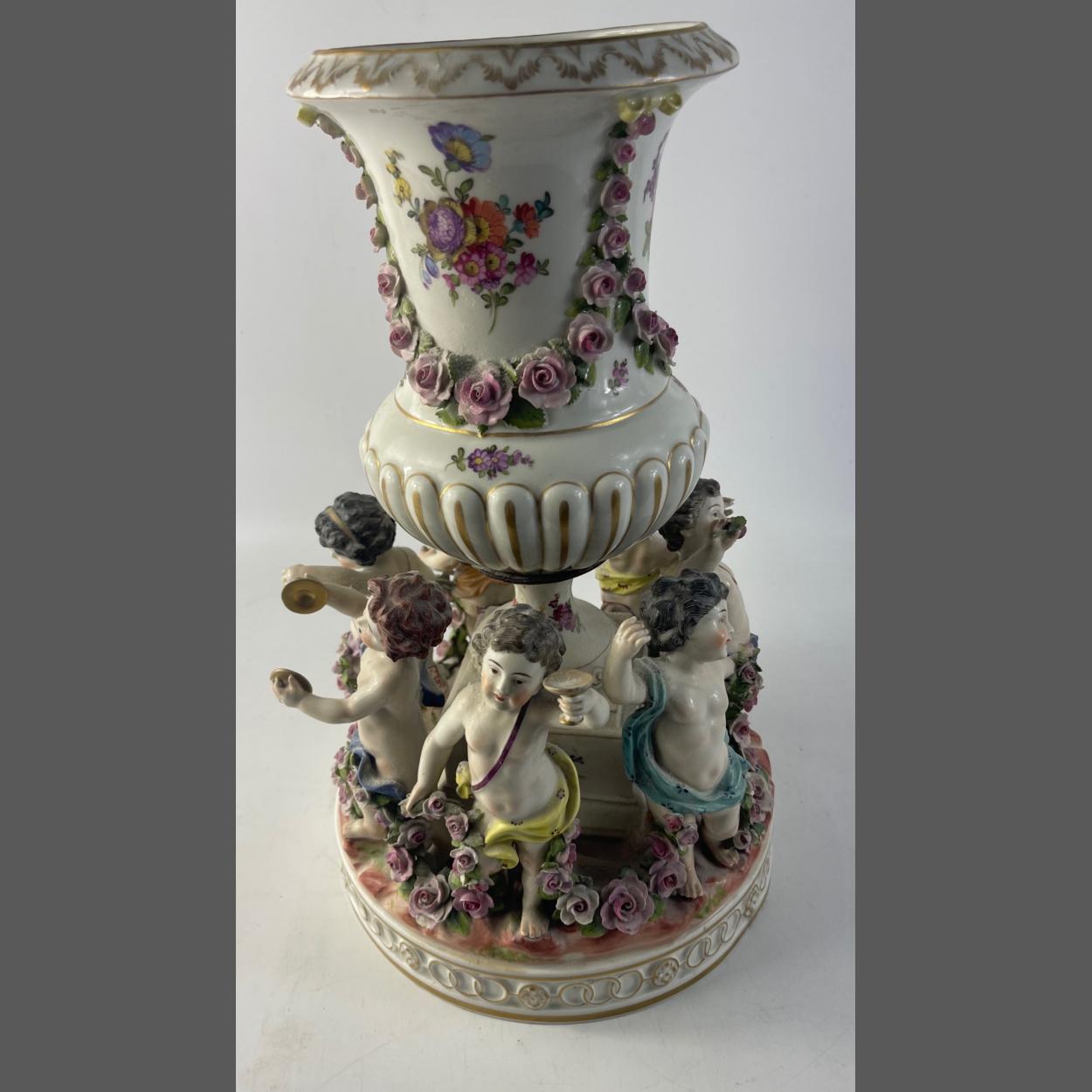 ANTIQUE c1870-90 GERMAN PORCELAIN - LUDWIGSBURG blue stamp to base large centrepiece stand with raised floral decorated urn with 8 eight children playing to base and decorated with floral garlands - no damage is noted to any missing fingers or flowers etc, however there is a historical crack on the base (see pic gallery)which is hardly noticeable, this item is in remarkable condition! - dimensions 37cm tall x 20cm wide approx
