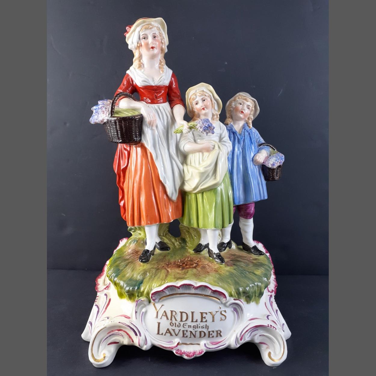 A large DRESDEN porcelain Old English Lavender advertising figure - based on 'Wheatleys Primrose sellers from his cries of London' - Dresden c1910 - stamped Dresden to base - 31cm height x 19cm wide approx