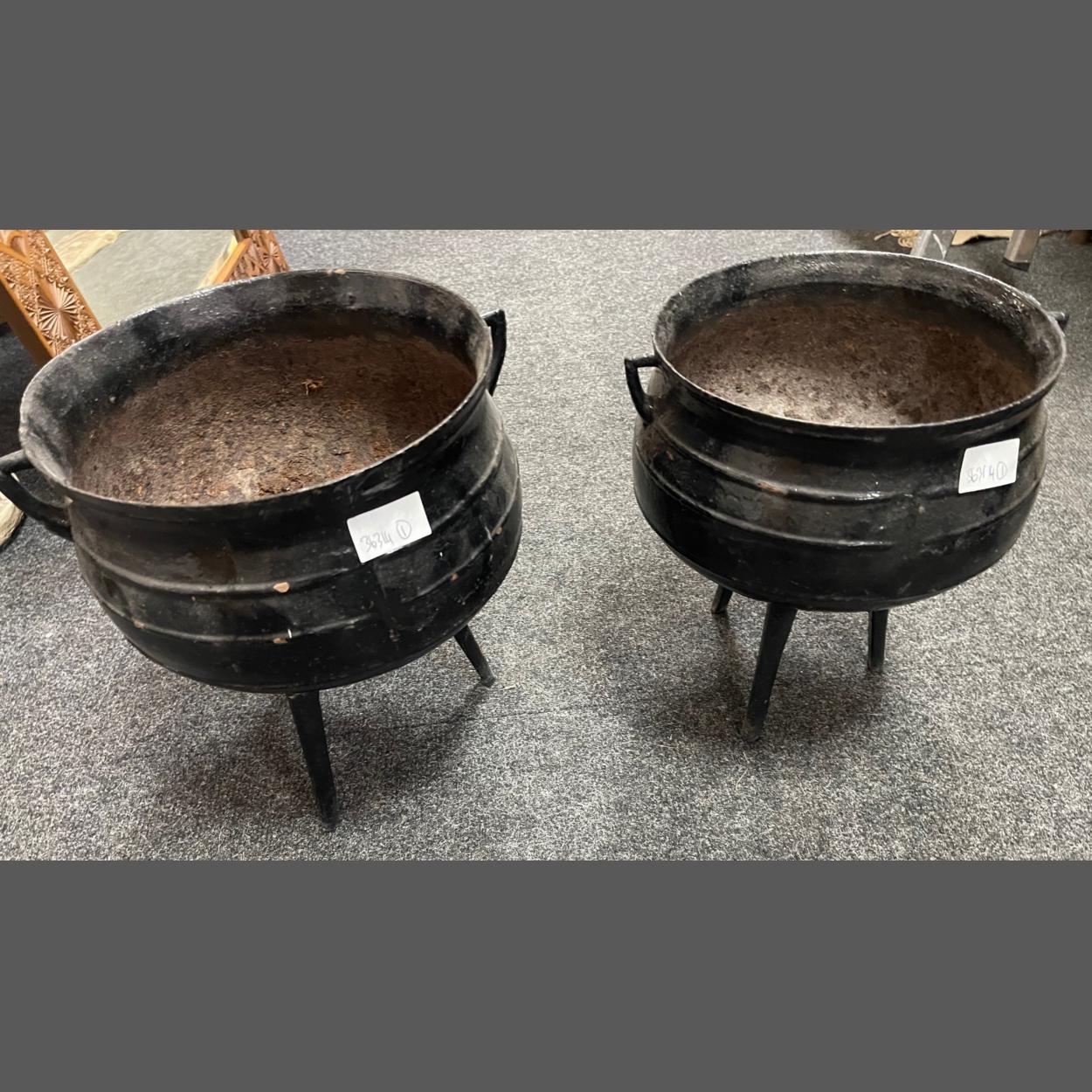 Two medium and smaller sized 'WITCHES CAULDRONS' in cast iron c. late 19th century - would make ideal planters for the garden - larger dimensions 24cm height 28cm approx