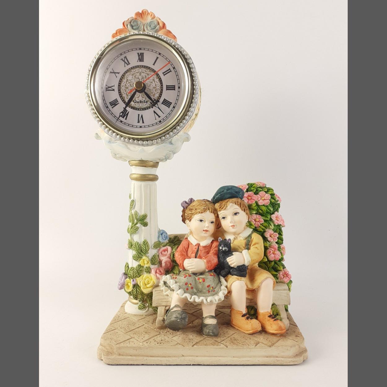 A CROSA 1994 quartz clock with 2 small children and a kitten, stands 28cm tall