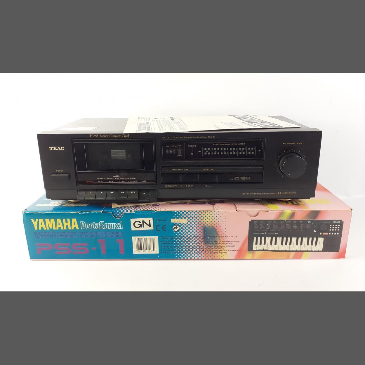 A TEAC V-275C/V-255 stereo cassette deck with instructions and a YAMAHA PortaSound PSS-11 boxed keyboard