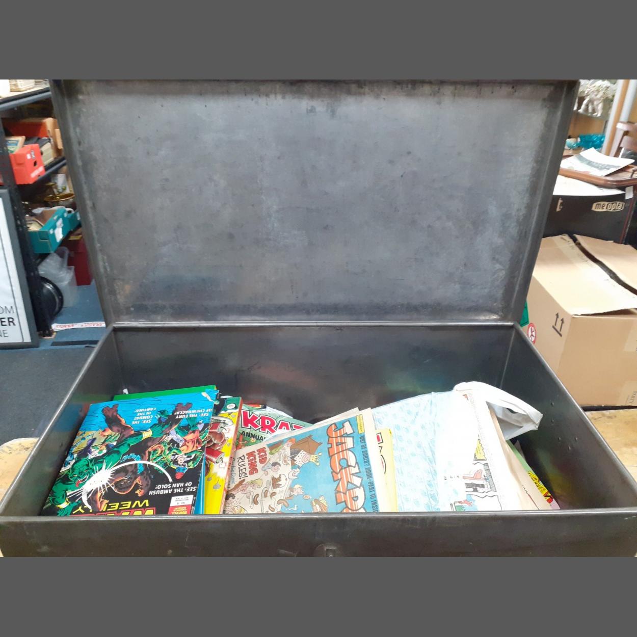 A large tin trunk, (excl contents) measures 77x45x41cm