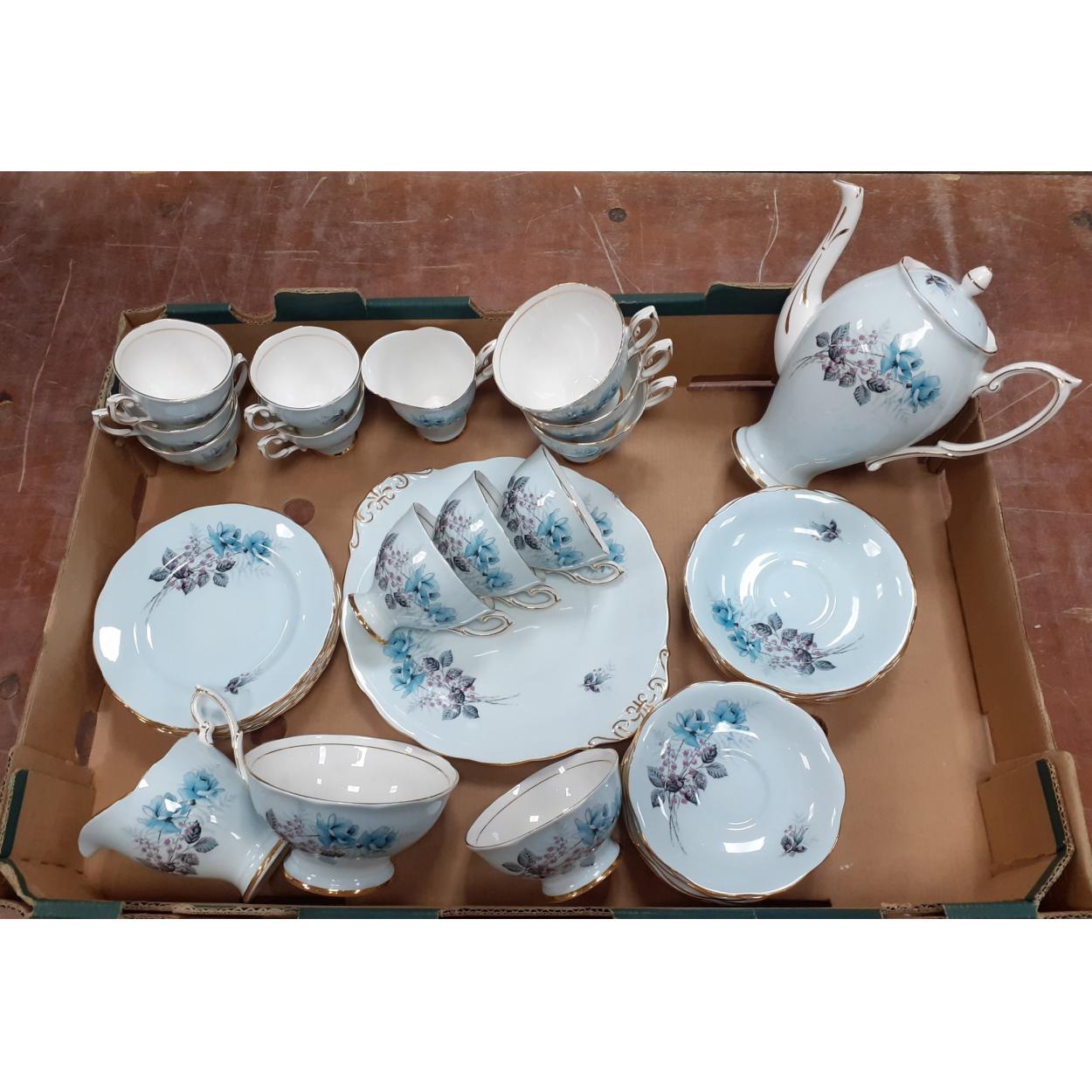 ROYAL STANDARD fine bone china tea set in an attractive powder blue colour, comprising teapot, milk jug, cream and sugar, one large plate, six tea cups and five coffee cups all with saucers and six side plates. All in good order