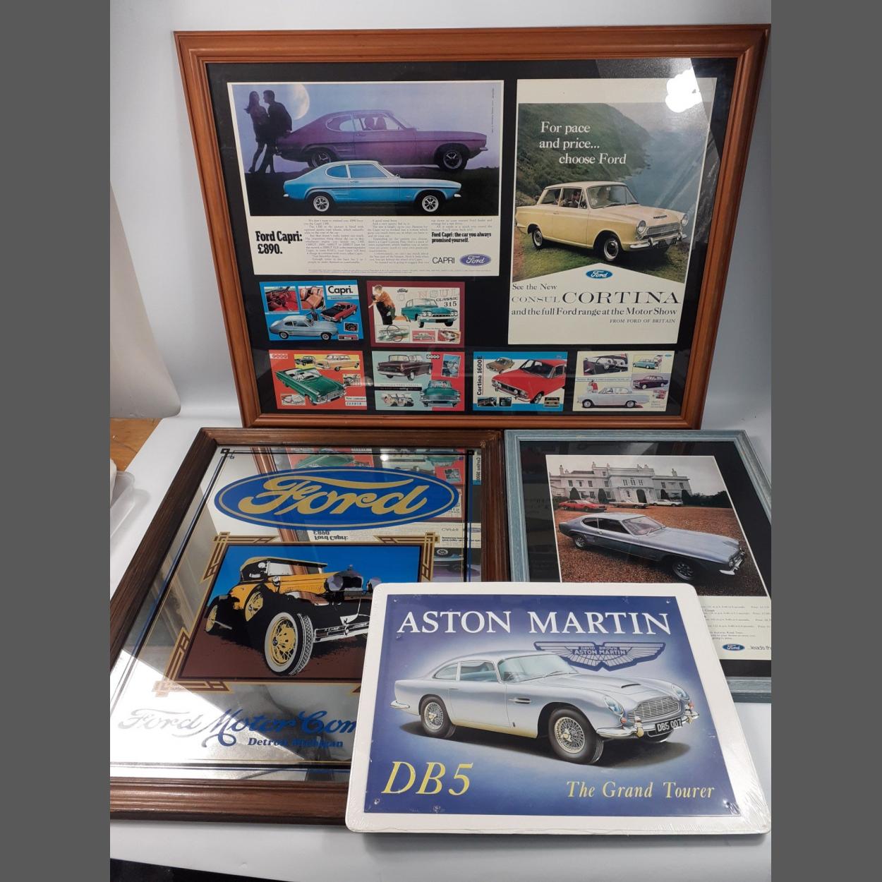 Four automotive framed pictures. The largest a superb compilation of copied adverts for the FORD CAPRI and FORD CORTINA measuring 87 x67 cm approx. The second a lovely copy of a FORD CAPRI measuring 55cm x 45cm approx. Also included an early FORD mirrored advert and a modern ASTON MARTIN tin sign. A super collection for the Automotive enthusiast.