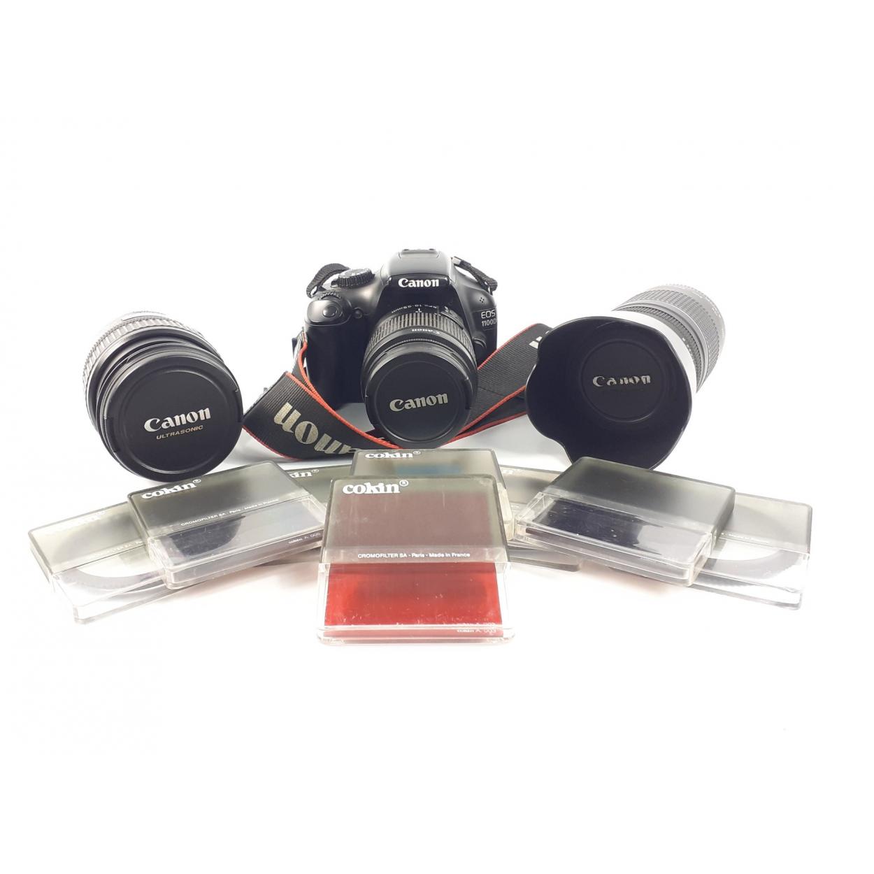 Canon EOS 1100D camera with an image stabilizer, a Canon zoom lens, EF-S 17-85mm 1:4-5.6 USM, a Canon zoom lens, EF-S 18-55mm 1:3.5-5.6 lll, a Canon zoom lens EF 75-300mm 1:4-5.6, a Prinzflex Auto Reflex 1:2.8 f=135mm 55 No 732359, a Helios MC Zoom Auto 1:5:6 f=80 -200mm lens, a Helios-44M 2/58 lens, a Helios Auto Tele Converter 3X, a Vivitar MC Tele Converter 2X-1, Kenko Wide Conversion Lens x0.7 W-07P, an ET62 lens hood, a flash gun, plus a quantity of lenses all within its own padded carry case plus two aluminium cases one with a wide selection of lenses