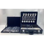 SUISSINE Cutlery set. Beautiful unused, vintage Suissine set in 18/10 mirror polished stainless steel with 22k gold-plated embossed highlight presented in artificial leather cases. Handles are stamped Suissine 18/10 (18 percent chromium and 10 percent is nickel). The brief case contains 12 steak knives, 12 teaspoons, 12 cake forks, 2 serving spoons, 1 cake server, 2 fruit/vegetable serving spoons, 1 soup ladle, 1 gravy ladle, 1 pair of sugar tongs, 2 deli forks, 1 small serving spoon, 12 dinner knives, 12 dinner forks, 12 dinner spoons. Also included is a separate case of 12 additional knives.