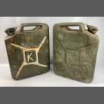 A pair of military jerry cans both carrying broad arrow military issued stamps. One stamped RTB CP&F and the other BSC CPW 1980 47x 34x 17cm approx