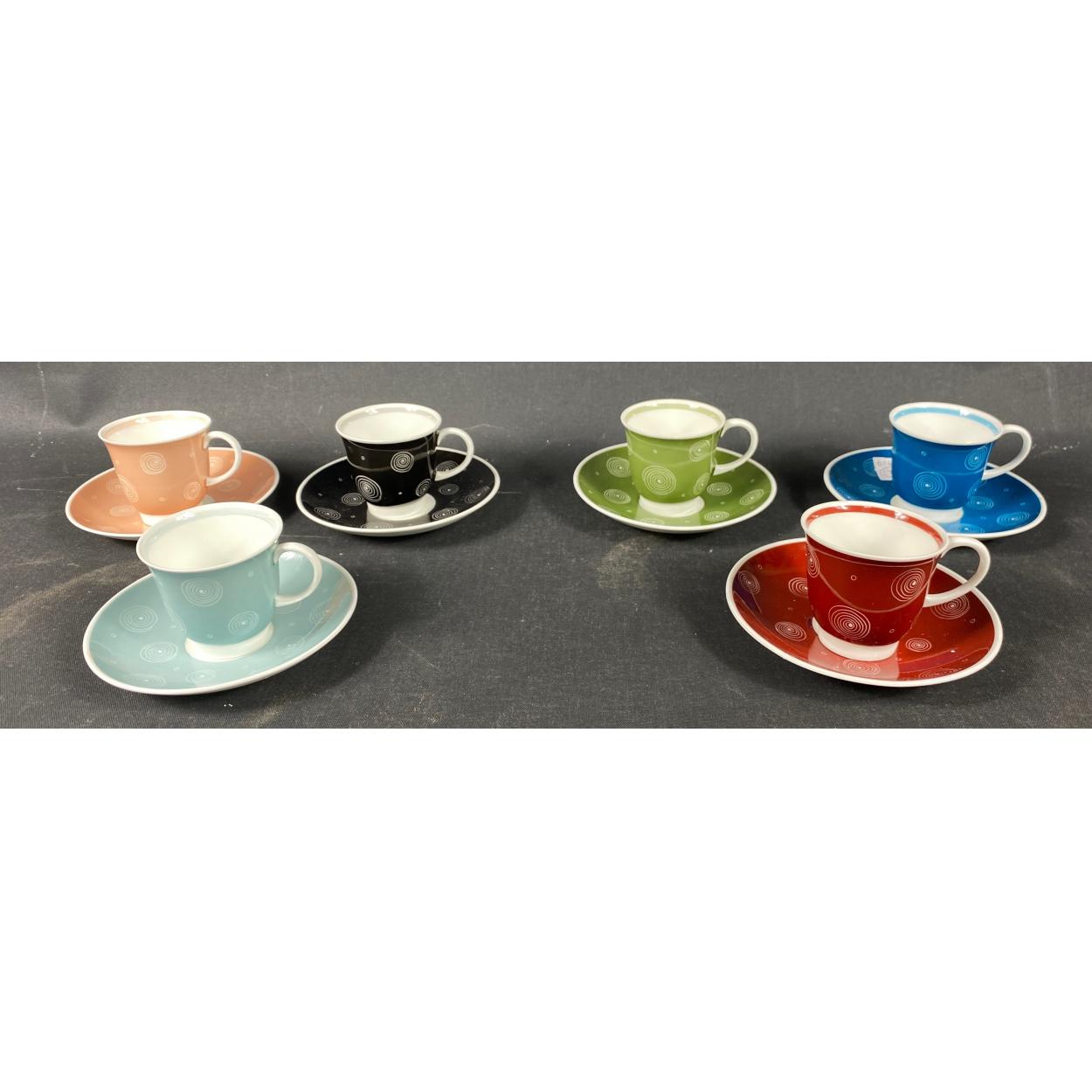 A vibrant set of collectable SUSIE COOPER bone china coffee cups and saucers. 6 cups and 6 saucers. Dimensions - saucers 14cm wide. Cups 8cm tall.