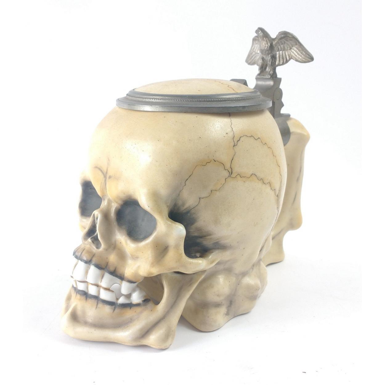 An unusual skull shaped tankard with eagle finial, stands 17cm tall, 18cm wide approx