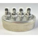 An attractive RENNIE MACKINTOSH style pewter jewellery box (11cm long) with contents of four early bone china BEATLES thimbles each 3cm high