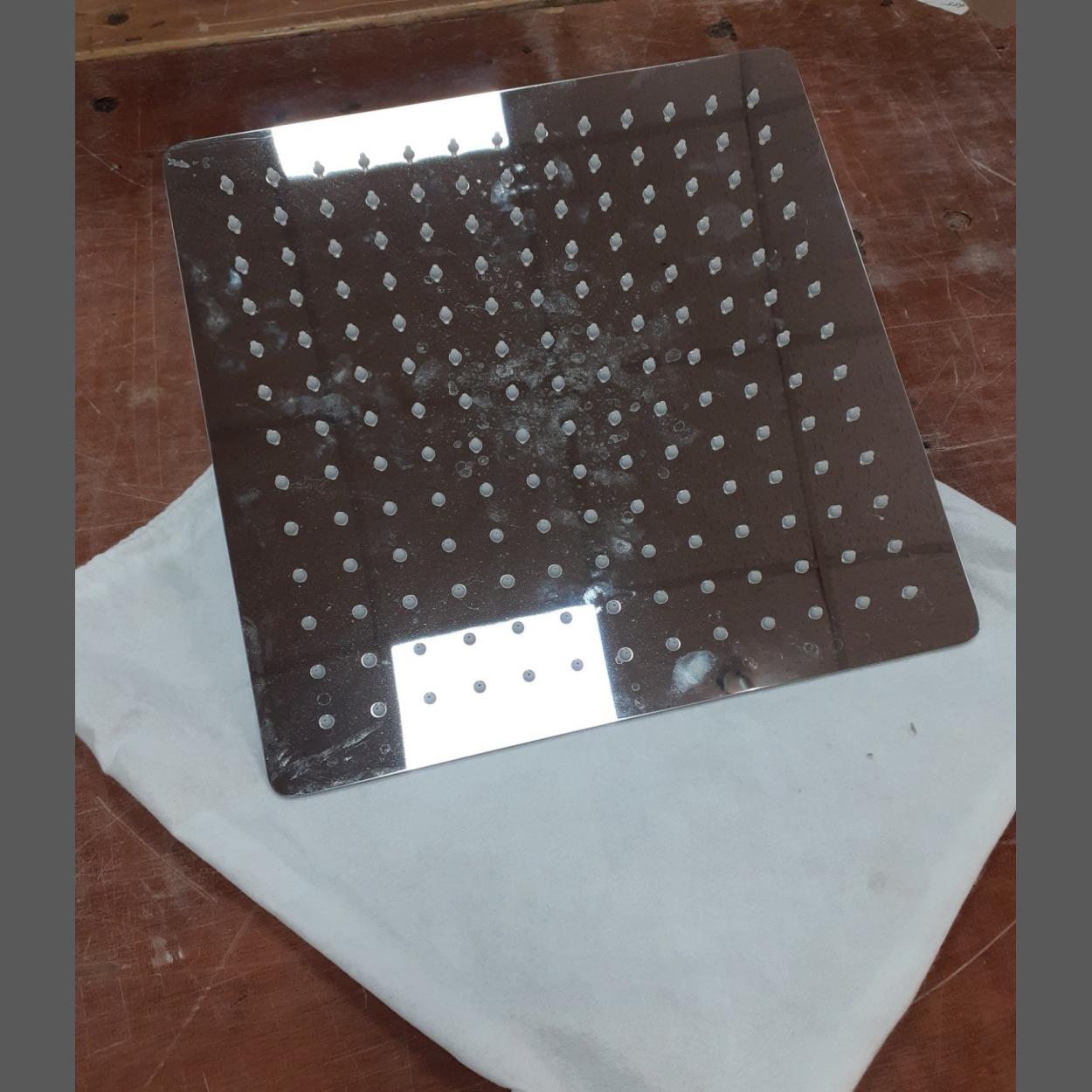 A brand new unused large Rainfall shower head in chrome finish. Measures 30cm x 30cm.