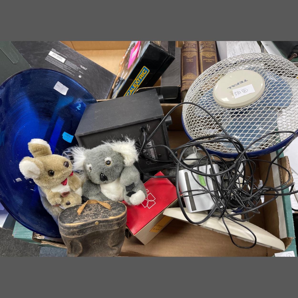 WHAT A BARGAIN! A mixed box to include cuddly toys, a heavy skillet iron pan, a Tefal desk fan and a large blue glass fruit style bowl etc