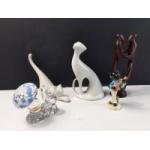 A decorative lot to include 2 cats one approx 20cm tall, the other 18cm long plus a GOEBBEL'S cat playing the banjo standing 12cm tall and a SILBERBERG-CRYSTAL mushroom and snail standing 11cm tall etc