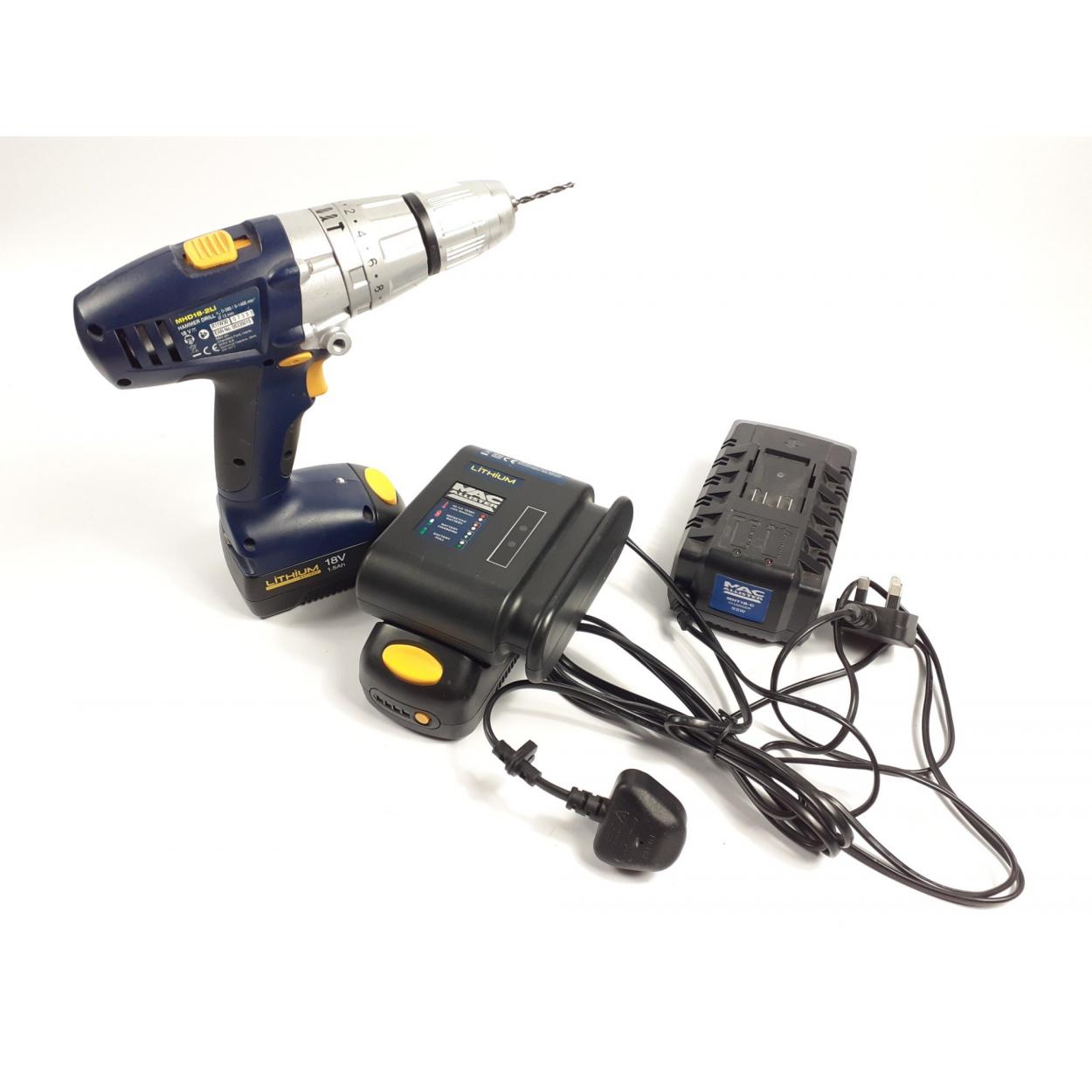 MacAllister R11W30 rechargeable power drill with two batteries and charger.
