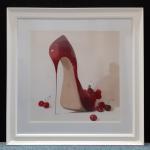 OOH LA LA print of a single stilletto heel and cherries. Colourful, unusual print. 77 x 73cm approx