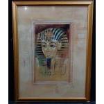 A large glazed and framed mixed media sketch of TUTANKHAMUN, artist's signature indistinct, frame size 89x68cm approx