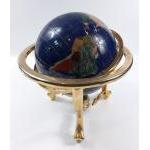 A claw-footed brass-mounted earth globe set with multiple semi-precious stones stands 48cm tall. One of the pedestal legs is loose