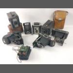 A wonderful vintage photography lot to include a Super Six-20 Kodak Eastman folding camera with lovely bellows and deco style side panels. Two other similar folding cameras. 4 boxed style folding cameras and a small pair of Gelert 8 x 21 folding field glasses