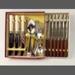 A small boxed set of cutlery by THOMAS TURNER comprising 6 each of forks, knives, spoons and teaspoons, plus a boxed set of 6 wooden handles steak knives by UNITY SHEFFIELD