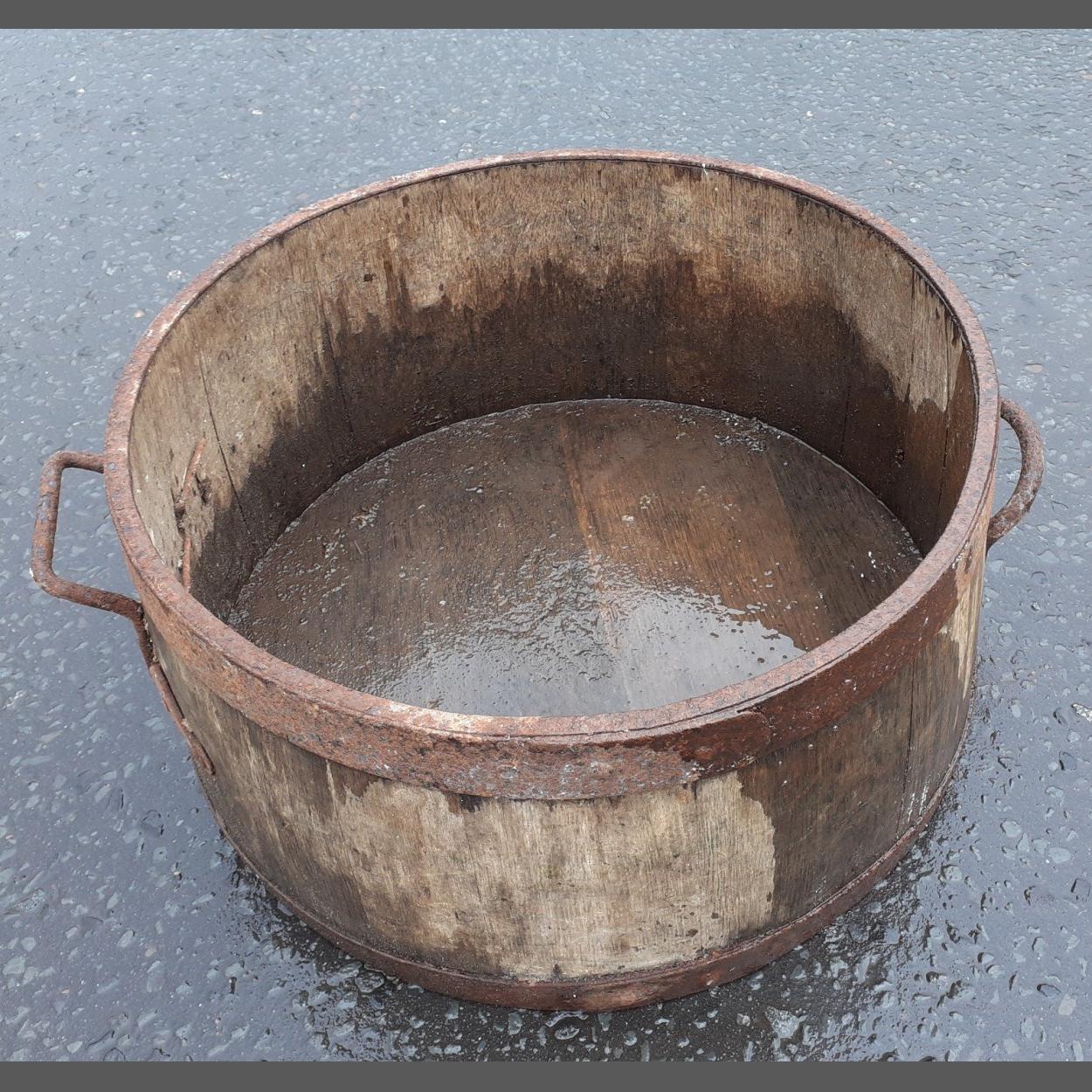 An antique half barrel planter marked Imperial Bushel 1882. Nicely aged. Still in good useful condition.