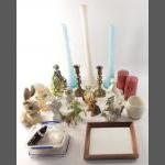 A mixed decorative lot to include glass vases, brass candlesticks and other ornamental items.
