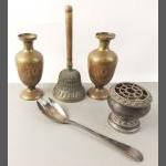 A small mixed decorative metalware lot comprising 2 Indian brass urns each 15cm, an Oriental style bell, a small rose vase and a plated serving spoon.