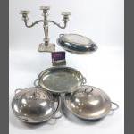 An EP lot to include 2 lidded Elkington dishes, Squirrel Brand oval serving dishes, a 2 branch candelabra plus a boxed razor