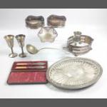 An EP tray 36cm approx, with glass insert, 2 goblets, 2 wine holders, large ladle, EP basket and a pair of fish knives