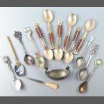 A small collection of plated teaspoons of interest. With a small HANDSTOPT TBT TIN Viking longship 7cm.