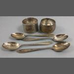 Two silver napkin rings, one with monogram Felicity stamped silver, the other hallmarked Birmingham 1897, weight 35g approx, plus 4 silver coffee spoons, hallmarked Birmingham 1939, each 11cm long, weight 42g approx