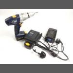 MacAllister R11W30 rechargeable power drill with two batteries and charger.
