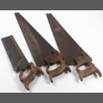 Three wooden mallets. One (UNUSUAL) with a leather rolled hide head. Longest 31 cms approx.