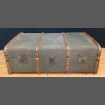 A large wooden banded travel trunk with brass corners 90x55x35cm approx, with wear in useable condition and contains a travel bag