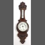 A vintage carved wooden banjo barometer with Fahrenheit temperature gauge, length 80cm approx