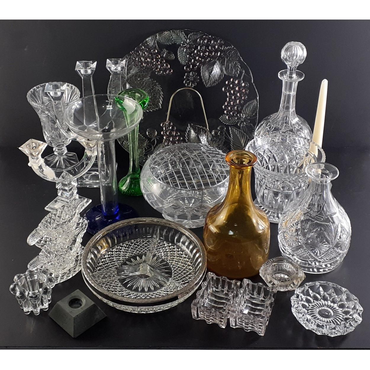 Mixed box of quality glassware to include vases, rose vases, decanters and much else.