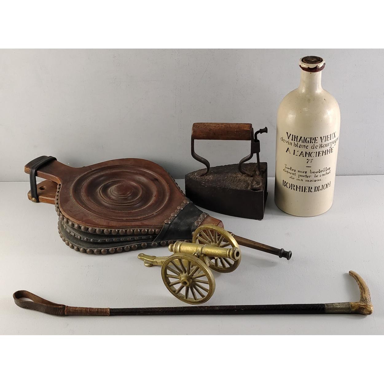 A mixed vintage lot to include a bottle of olive oil, pair of bellows, vintage riding crop, brass cannon, old flat iron