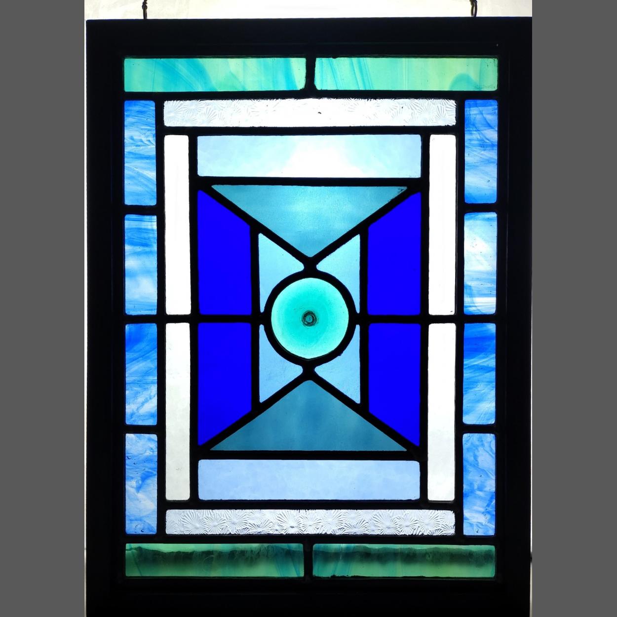 A lovely leaded glass pane wall hanger in blue and green tones. Nicely framed. 43cm x 33cm approx.