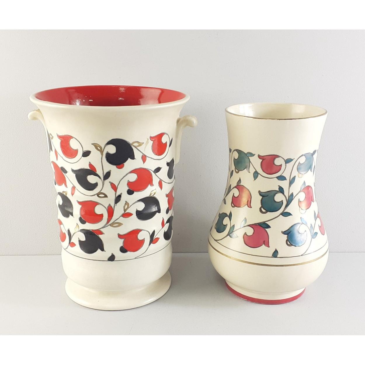 Two ROYAL DUCAL vases with Tudor-style designs. The first, tulip shaped stands 19cm approx and the other is twin-handled is 20cm approx