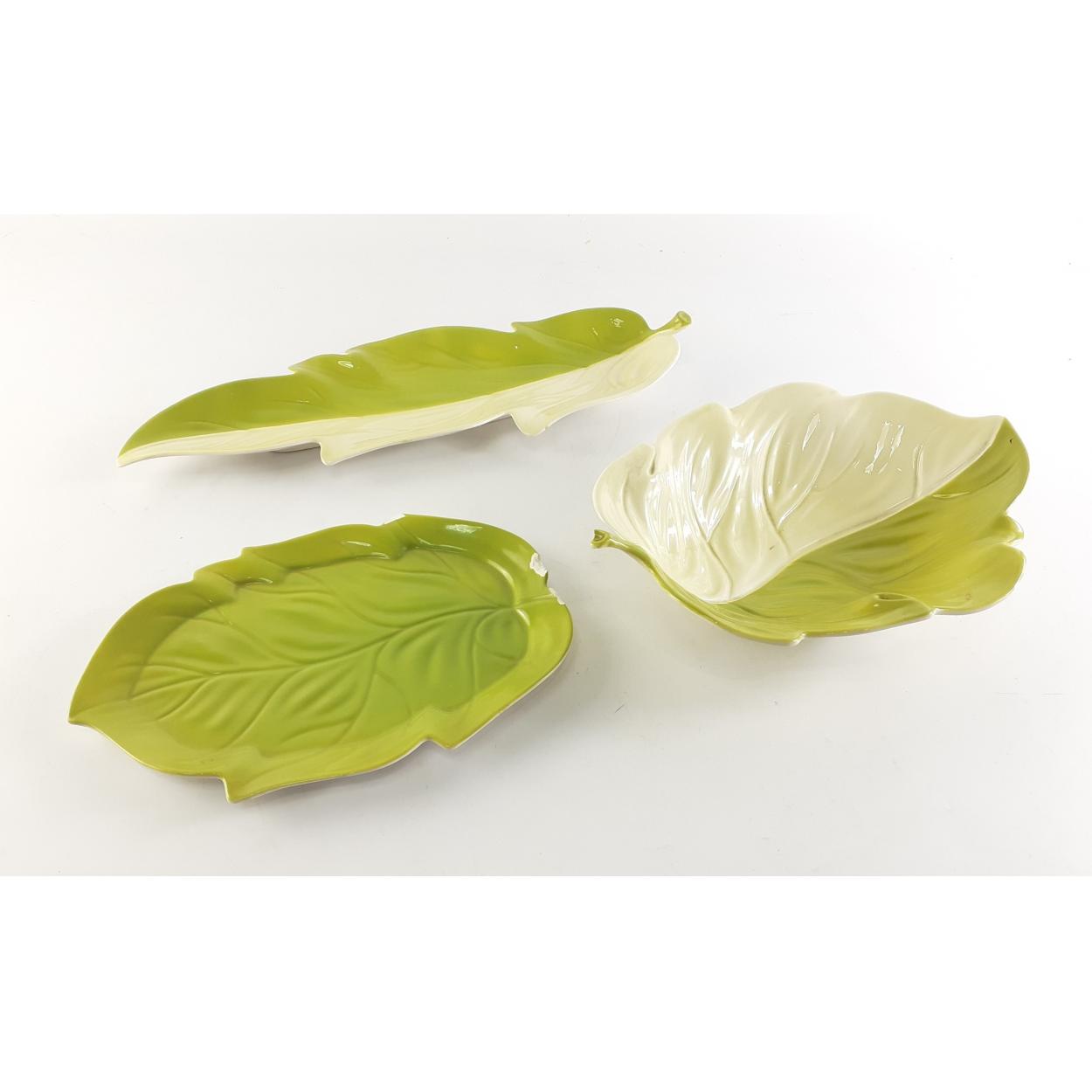 Three Australian CARLTON WARE leaf-shaped dishes, one with damage. Longest measures 34cm approx.