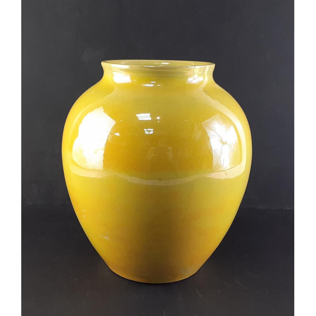 MOORCROFT Burslem Yellow Lustre Vase. Stands 26cm tall approx. A 15mm chip damage repair noted to the rim. An impressive and unusual piece.