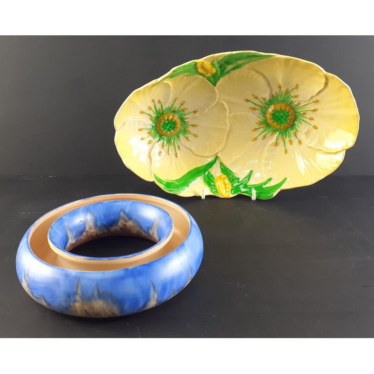 Two pieces of CARLTON WARE including a drip paint posy vase, 15cm diameter approx and a yellow pansy dish 17cm approx