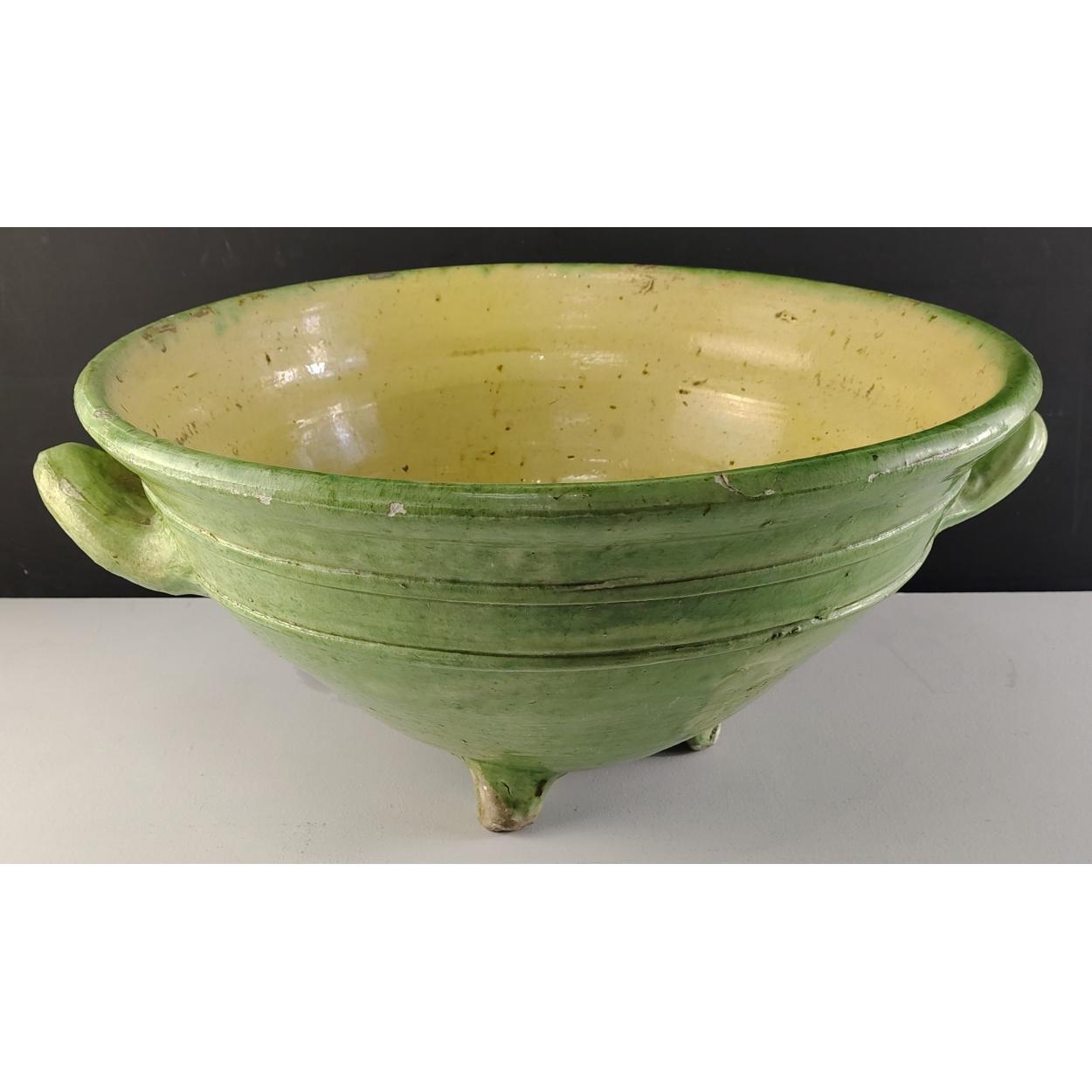 An antique green and yellow, 2-handled, 3-footed large bowl with 38cm diameter. Has seen much useful wear but an impressive looking piece.