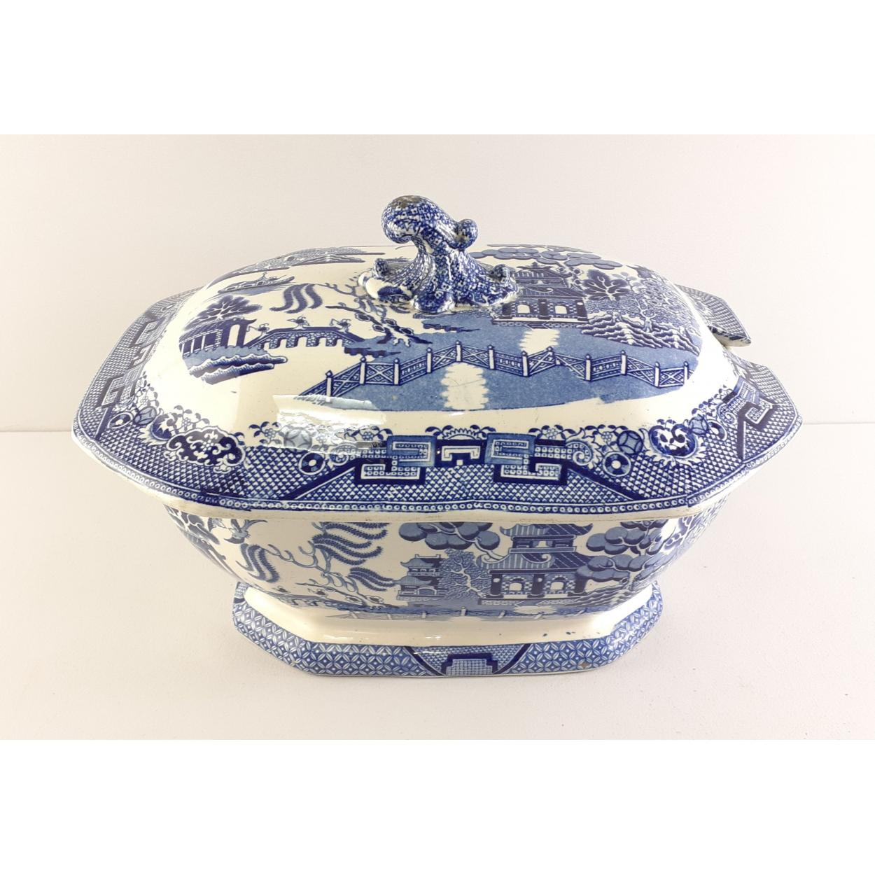 A large vintage blue and white STAFFORDSHIRE tureen. Chip noted in rim and cracking to glazing. 33 x 20 x 25cm approx