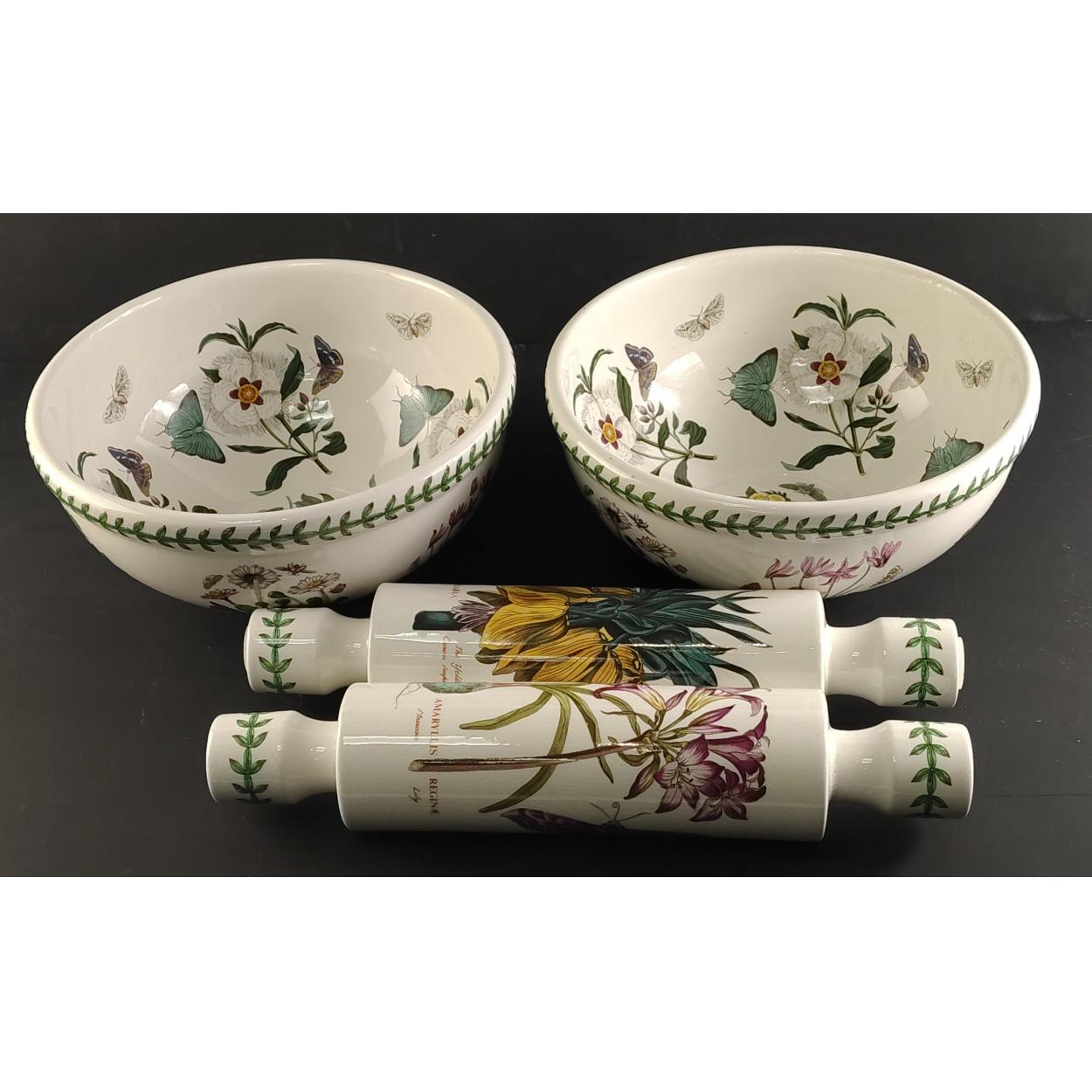 PORTMEIRION Two large mixing bowls in lovely condition with two rolling pins, one with stoppers. The largest 26cm diameter approx.