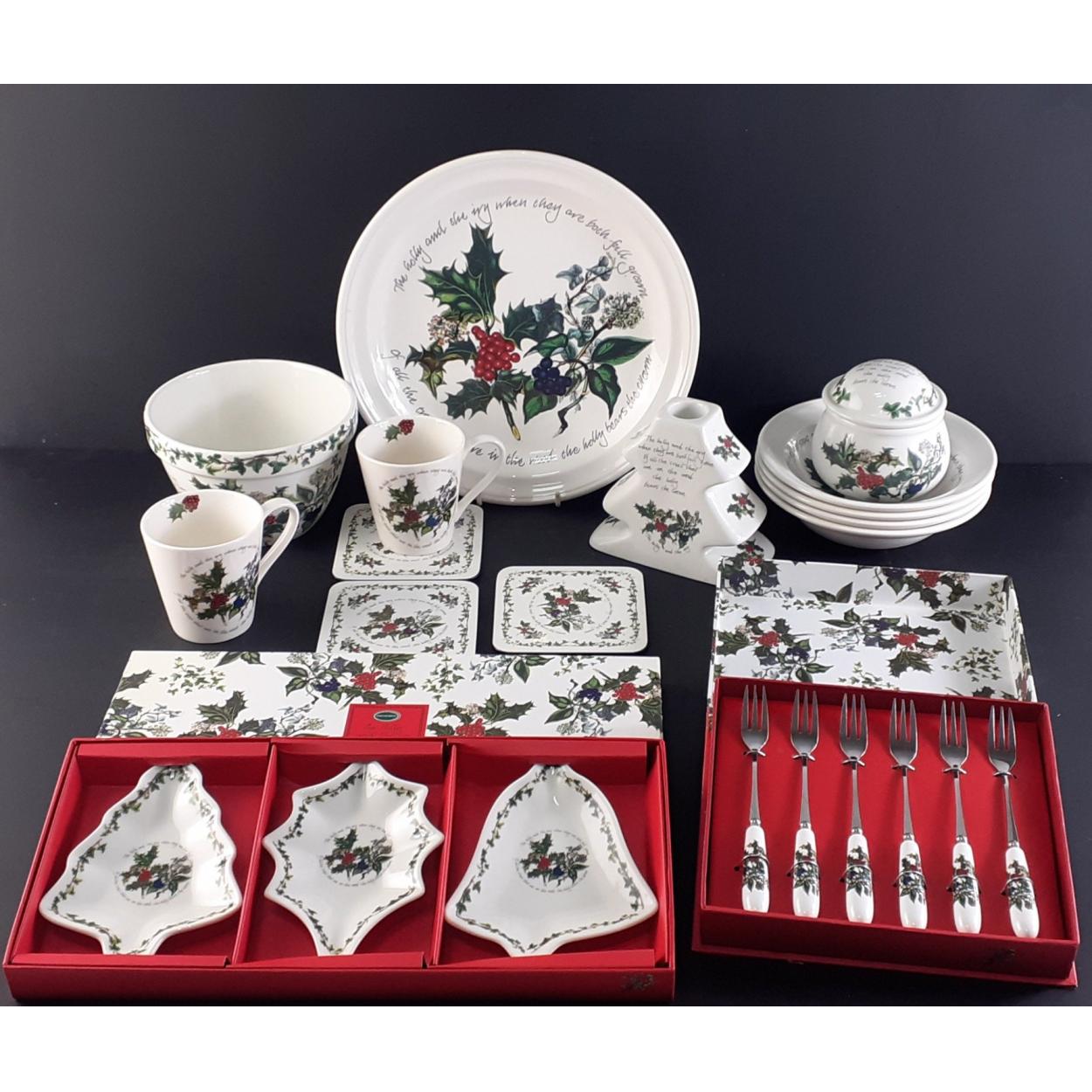 PORTMEIRION. CHRISTMAS selection to include four mistletoe bowls, a pudding bowl, a 27cm plate, boxed dishes, pastry forks, candle stick, mugs. All in good condition.