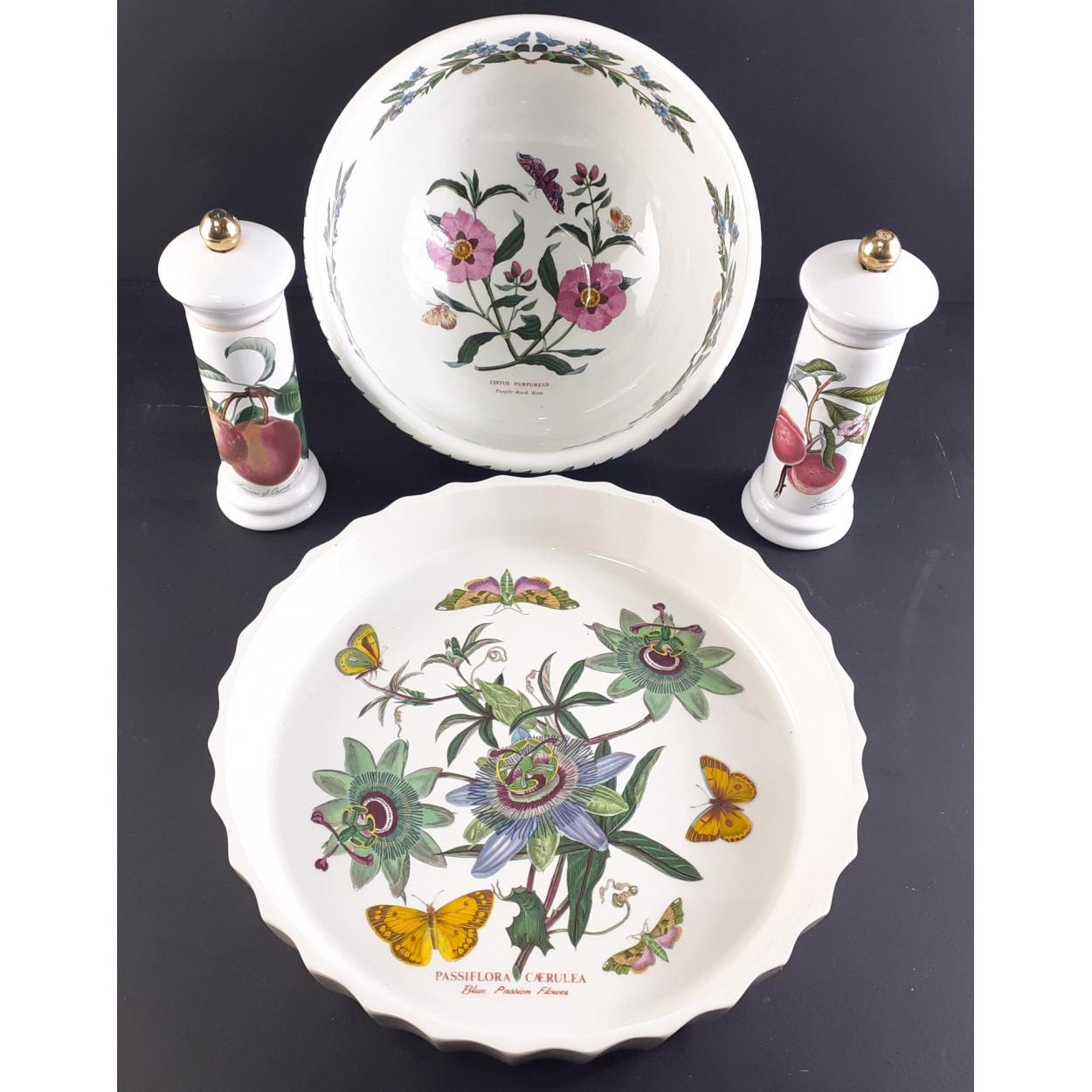 PORTMEIRION. Botanics flan dish 27cm, bowl, 23cm and a 15cm tall salt and pepper grinder.