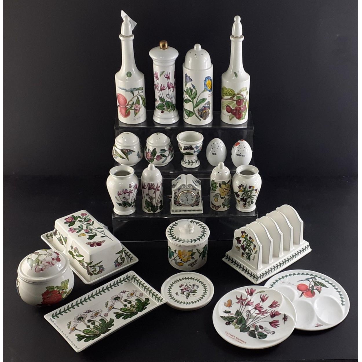 PORTMEIRION. A great selection of table ware items to include egg plates, condiment and sugar dispensers. Small clock, toast rack, tea bags, dishes etc.