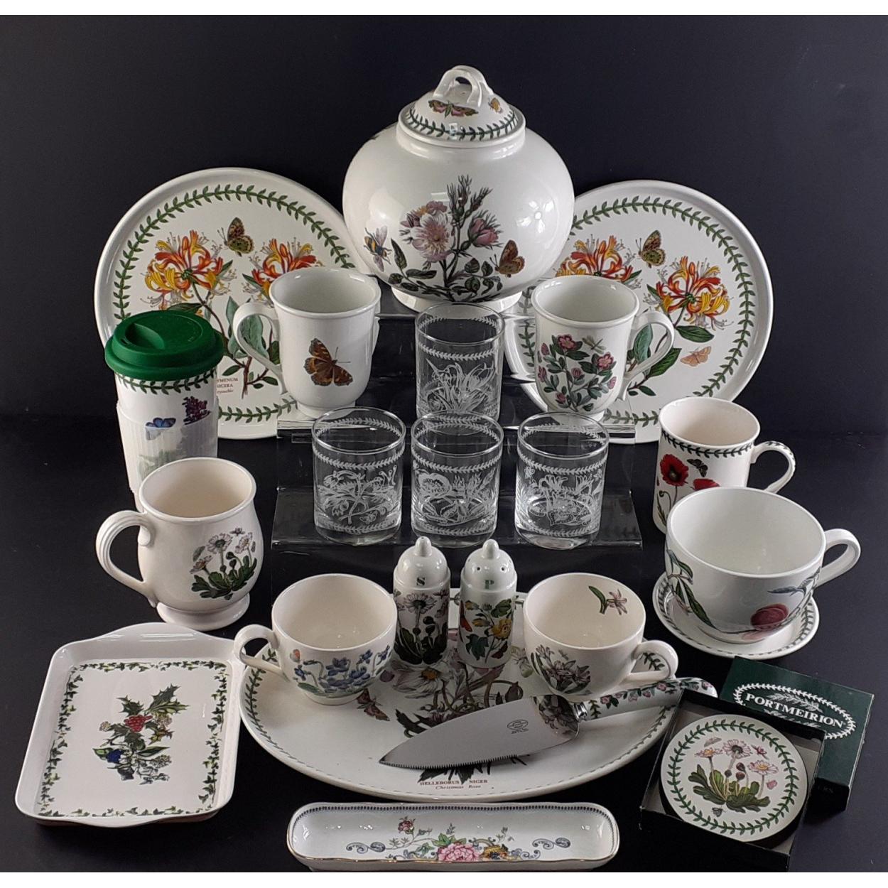 PORTMEIRION. A collection to include unusual thermos beaker, six mugs and cups, cruet set, coaster, cake knife oval platter 32cm, round 16cm dishes, a ginger jar with ill fitting chipped lid (otherwise all pieces excellent) and others.