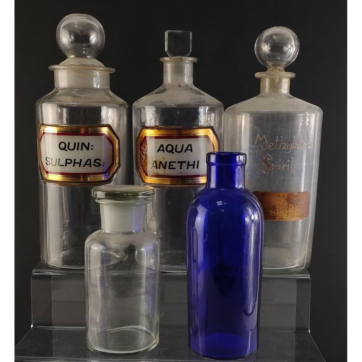 Five APOTHECARY bottles including Quin: Sulphas: (29cm approx), Aqua Anethi, Methylated Spirit and 2 unlabelled. Small chips in two but otherwise good condition.