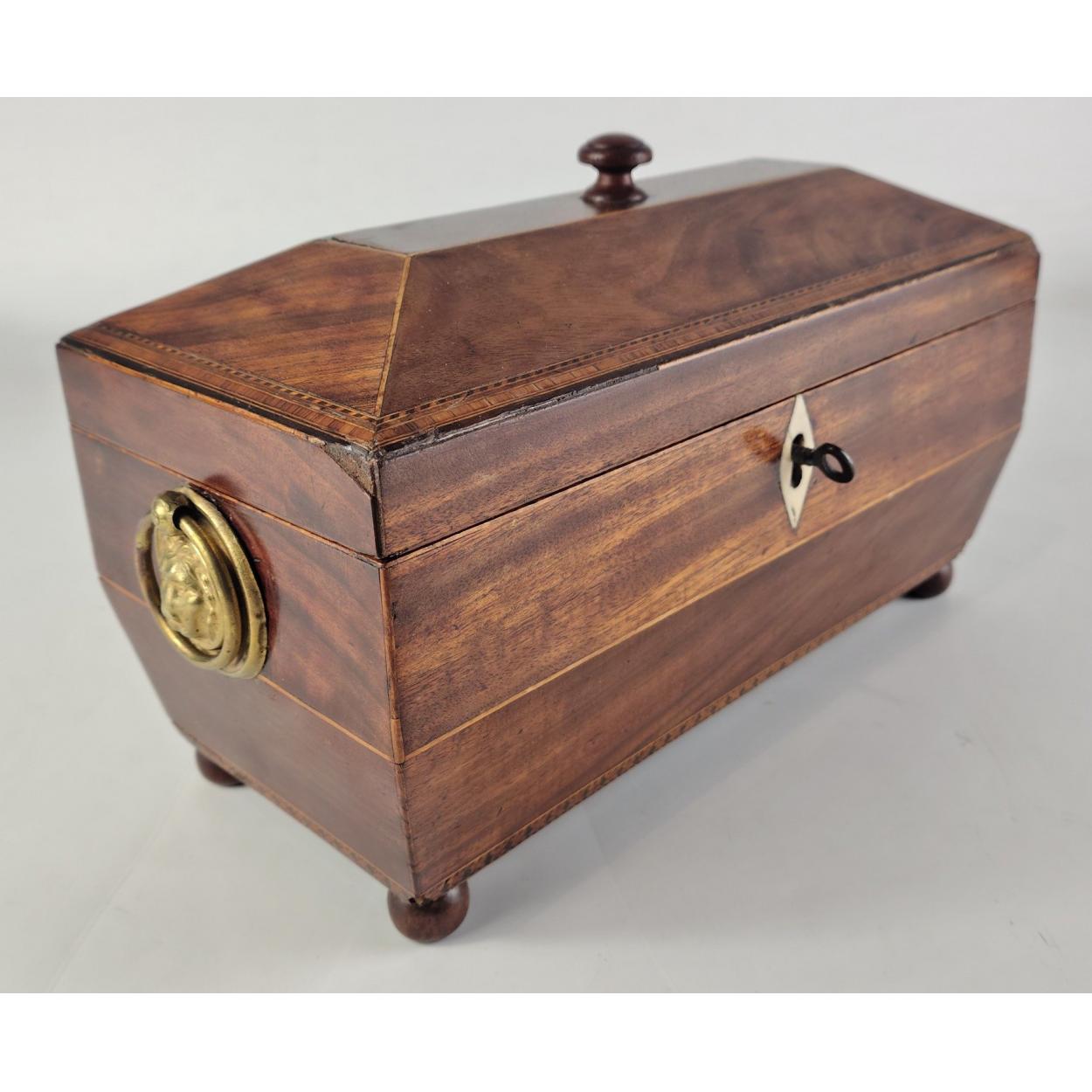 A sarcophagus shaped tea caddy with Lion Head handles, bun feet and key. Stands 16cm tall, 27cm wide and 13cm deep approx.